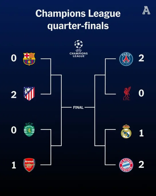 虎扑04月09日讯 欧冠1/4决赛首回合战罢,全部的4支主场作战球队遭遇1胜3负: