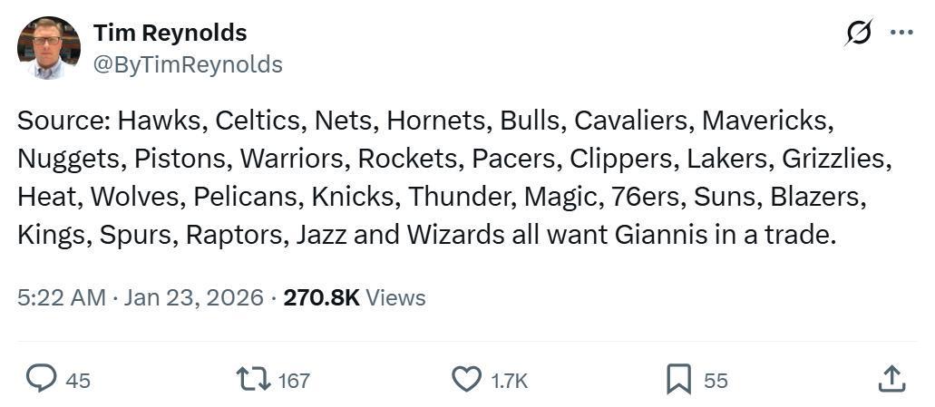 美联社知名记者Tim Reynolds就在报道中指出,如果字母哥进入交易市场,联盟中其余29支球队都对其有意,其中自然也包括火箭队。